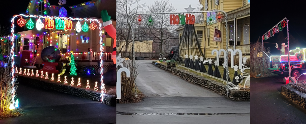 If you want a trim line to be embellished with something a bit fancier than a single light string or plain icicles, the HolidayCoro PixelTrim system is an interesting option. Start with an ~8′ plastic strip that holds either 12mm pixels or C9 brilliant bulbs, attach (using zip ties or Pivot Connector Buttons) motifs to the strip, and pop in some pixels. Zip tie to a pipe and clip to the house for easy installation and removal, or mount any other way you’d like.